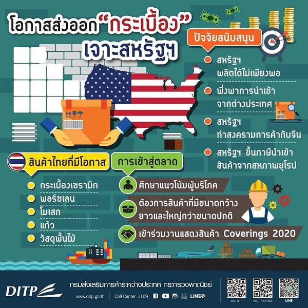 น.ส.นิธิมา ศิริโภคากิจ ผู้อำนวยการสำนักงานส่งเสริมการค้าในต่างประเทศ ณ เมืองไมอามี สหรัฐฯ กรมส่งเสริมการค้าระหว่างประเทศ (DITP) กระทรวงพาณิชย์ เปิดเผยถึงโอกาสการขยายตลาดสินค้ากระเบื้องปูพื้นและปูผนังในตลาดสหรัฐฯ ของผู้ประกอบการไทย ว่า ปัจจุบันการผลิตในสหรัฐฯ ไม่เพียงพอต่อความต้องการ และต้องพึ่งพาแหล่งผลิตกระเบื้องเซรามิกจากต่างประเทศ เนื่องจากปัจจุบันอุตสาหกรรมการผลิตในสหรัฐฯ ขาดแคลนแรงงานฝีมือ และค่าจ้างแรงงานสูงขึ้น รวมถึงปัญหาสงครามการค้าระหว่างสหรัฐฯ และจีน และยังมีการเพิ่มภาษีนำเข้าสินค้ากระเบื้องเซรามิกจากประเทศในสหภาพยุโรป (อียู) เป็น 100% ทำให้ประเทศต่างๆ เช่น อิตาลี สเปน โปรตุเกส ได้รับผลกระทบ จึงเป็นโอกาสของสินค้าจากไทยในการขยายตลาดวัสดุปูพื้นเข้าสู่ตลาดสหรัฐฯ ได้